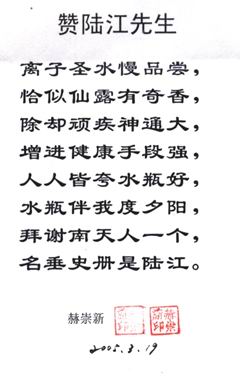 3. 詳細(xì)了解請上網(wǎng),可見臨床報告,鑒定證書、專家評說、治病機(jī)理、用戶反饋、題詞、詩歌、錦旗等彩色掃描件,被譽為"神奇水瓶"。